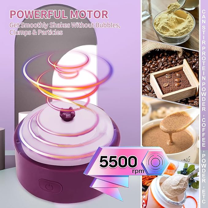 • 【Efficient Mixing at Your Fingertips】Featuring two operating modes, a single button press initiates a 30-second automatic blending, while a double click extends it to 100 seconds. The high-speed motor of the shaker bottle effortlessly blends protein powder into a smooth liquid without any clumps. Suitable for various water-soluble powders such as protein powder, fiber supplements, and oat powder, eliminating the need for manual shaking. NOTE: NOT SUITABLE FOR FRUITS OR ICE