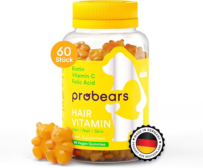 Probears® Biotin (B7) Vegan Hair Growth Gummies Vitamins - 10.000 mcg,Essential Vitamins A, B5, B6, B12, C, D2, E for Hair Loss Prevention - Gluten-Free, Gelatin-Free, Halal - 60 Count