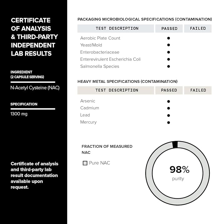 • The Highly Purified Form of NAC - Batches are third-party lab tested to ensure a minimum of 98% purity in every serving, meaning you are not just getting the highest dosage of n acetyl cysteine, but also the purest (most other n-acetyl cysteine and nac supplements won’t reveal their purity levels).