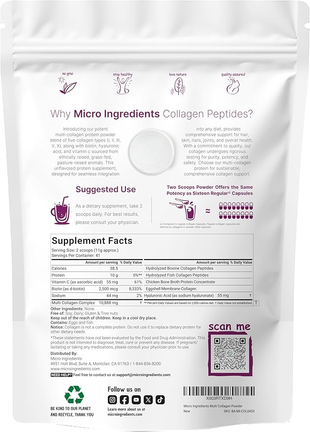 • Micro Ingredients 8 in 1 full spectrum hydrolyzed collagen peptides powder. The ultimate anti-aging complex that offers up to 11g of pure pasture raised collagen peptides per serving. Created with premium hydrolyzed collagen for complete and efficient absorption that nourishes the hair, skin, nails, and joints.