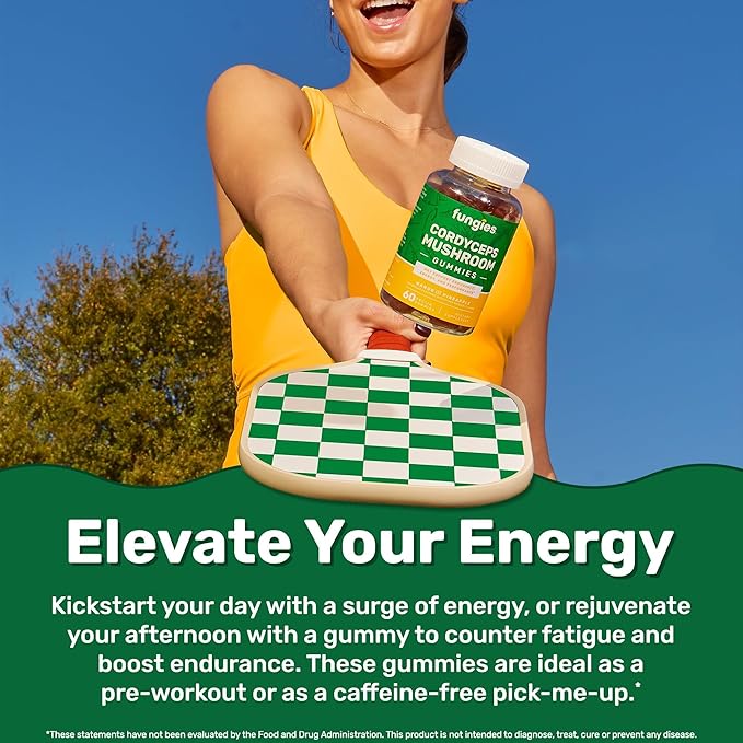 • ELEVATE YOUR ENERGY — Discover the power of Fungies Cordyceps Mushroom Gummies for a natural energy boost. Crafted with Cordyceps militaris extract, these super mushroom gummies are a caffeine-free way to elevate your energy levels. Perfect for when extra vitality is needed, each mushroom gummy is a daily dose of performance mushrooms energy, enhancing alertness and focus without caffeine jitters. Ideal for demanding tasks or active lifestyles to keep you alert and sharp.*