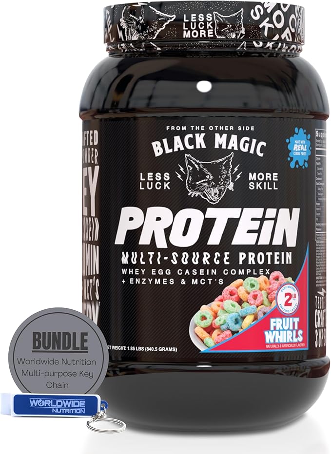 Worldwide Nutrition Black Magic Multi-Source Protein Powder - Whey, Egg Albumin Enzymes, Micellar Casein & MCTs - Muscle Mass Gaining - Fruit Whirls Flavor - 2 LB with Bonus Multi Purpose Key Chain