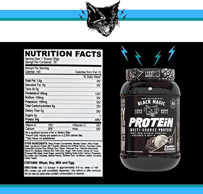 • 😋Delicious Taste - Black Magic Protein is Cookies and Cream flavored and made with REAL cookie bits! This low sugar flavored whey protein powder is great for working out and providing your vital protein requirement.