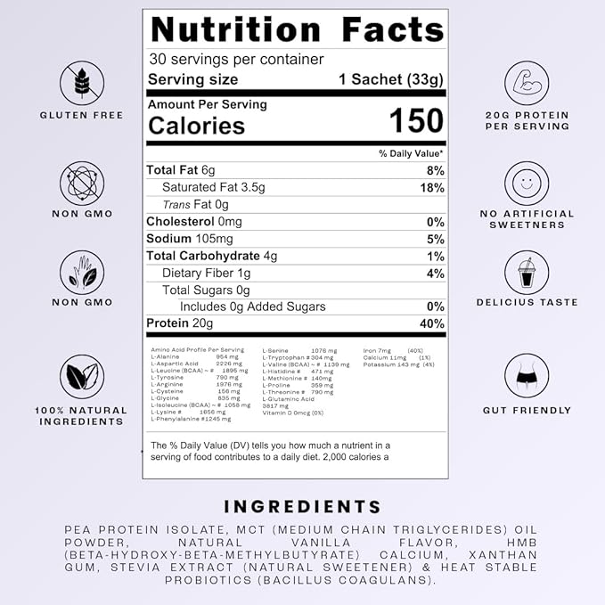 • 20g of Plant-Based Protein Per Serving - Get a powerful 20 grams of high-quality pea protein in every serving. With an amino acid profile containing 18 essential and non-essential amino acids, This plant protein powder is a complete plant-based organic protein source. Perfect for those seeking muscle recovery, strength building, and improved endurance without compromising on nutrition.