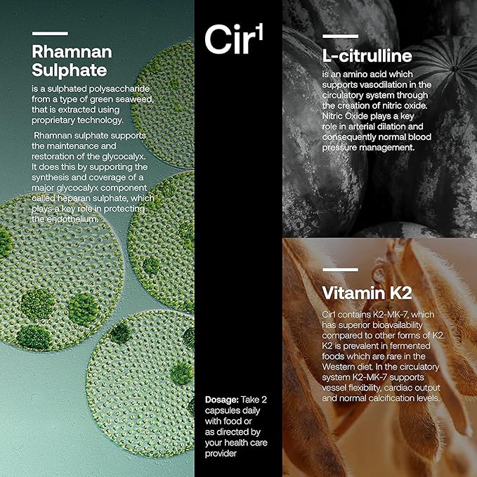 • UNIQUE BLEND: Cir¹ contains ingredients from the forefront of scientific research, including Rhamnan Sulphate for blood vessel lining support; L-citrulline for blood pressure management, and Vitamin K2 for general circulatory health.