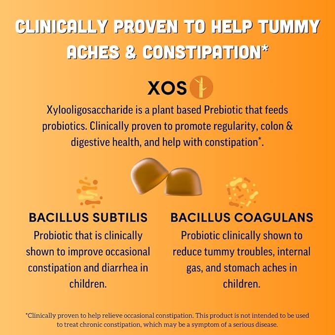• Clinically Proven --- These probiotics for kids reduce tummy aches, occasional constipation, and boosts overall gut health! Our gummies are made with a unique blend of fruits + prebiotics & probiotics that aid your kids’ guts naturally – without any bloating or side effects!