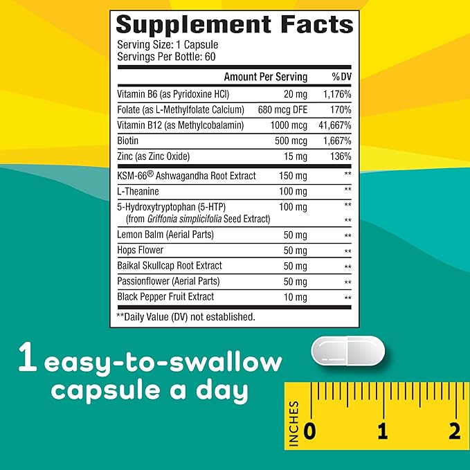 • POWERFUL RESEARCHED INGREDIENTS: These capsules are formulated with 20 mg vitamin B6, 680 mcg DFE folate, 1000 mcg vitamin B12, 500 mcg biotin, 15 mg zinc, 150 mg KSM-66 ashwagandha root extract, 100 mg L-theanine, 100 mg 5-Hydroxytryptophan (5-HTP), 50 mg lemon balm (aerial parts), 50 mg hops flower, 50 mg baikal skullcap root extract, 50 mg passionflower (aerial parts), and 10 mg black pepper fruit extract.