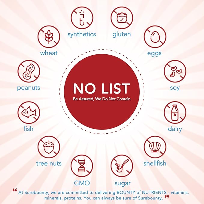 • No Allergens or Nasties: Surebounty has always been dedicated to formulating supplements that cater to people from all walks of life and can easily fit into their daily routines. We want you to enjoy the amazing benefits brought by our products without worrying about getting allergic. Be Assured: NO GMOs, soy, gluten, milk, sugar, egg, wheat, corn, nut, fish, shellfish. And never will you find Nasties like artificial ingredients, fillers, binders, or preservatives in Surebounty!