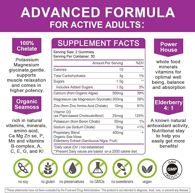 • Calcium Absorption: Our plant calcium supplements are expertly active formulated with superior synergistic Magnesium Glycinate, Potassium, D3 , Zinc,Natural Vitamin, Minerals (K2..) Together work help you get more benefit, Seamoss calcium absorption up to 96%