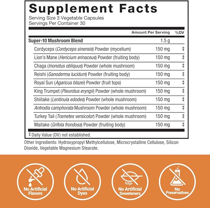 • CONTAINS 10 FUNCTIONAL MUSHROOMS: Every serving provides a powerful, all-in-one blend of functional mushrooms, including cordyceps, reishi, chaga, lion’s mane, shiitake, turkey tail, maitake, agaricus blazei, king trumpet, and antrodia camphorata.