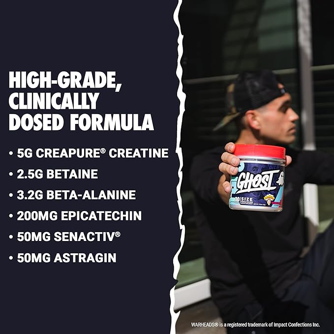 • GHOST SIZE: A clinically dosed, pure, and packed-to-the-nines muscle builder. Warheads Sour Watermelon flavor. 30 servings per tub.