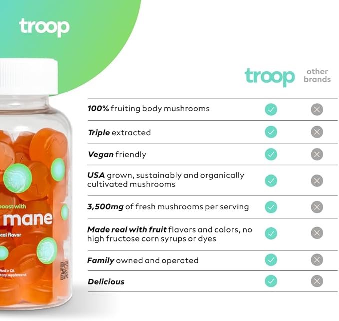 • Simple and Tasty: Troop Lion’s Mane daily gummies are easy to digest, convenient, and come with a one-month supply of 60 gummies per bottle. Bid farewell to powders, tinctures, and pills!