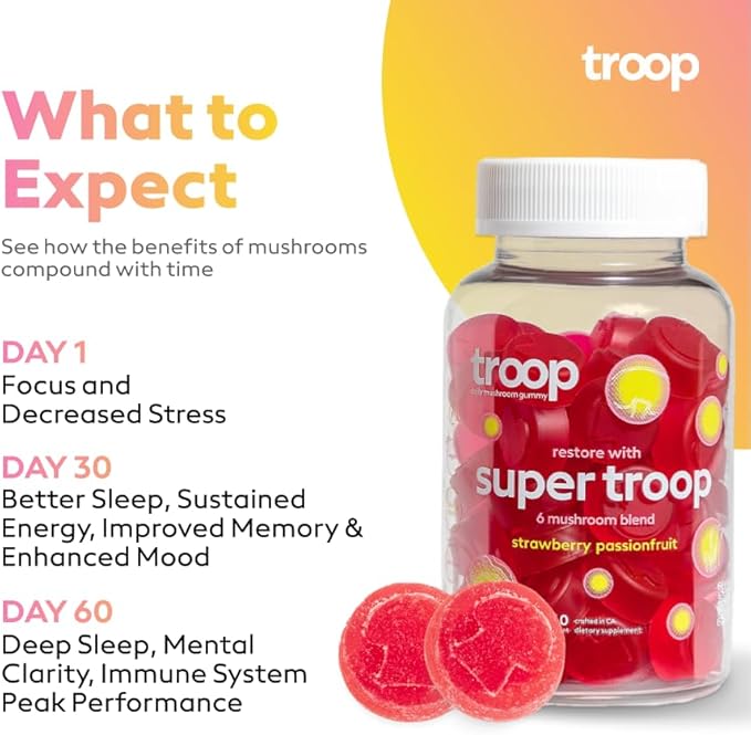 • Convenient Daily Wellness: Troop Super Troop daily gummies offer a simple and enjoyable way to include a variety of mushrooms in your routine, with a one-month supply of 60 gummies per bottle.
