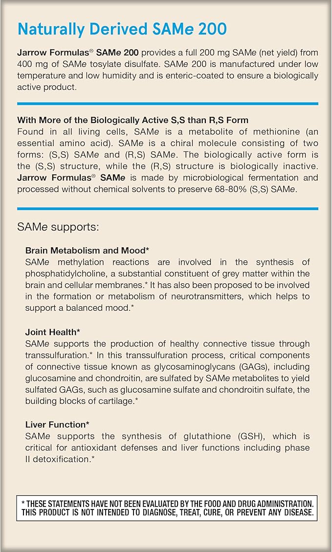 Jarrow Formulas Same 200 mg, Supports Joint Health, Liver Function, Brain Metabolism, 20 Tablets, Up to A 20 Day Supply (Pack of 12)