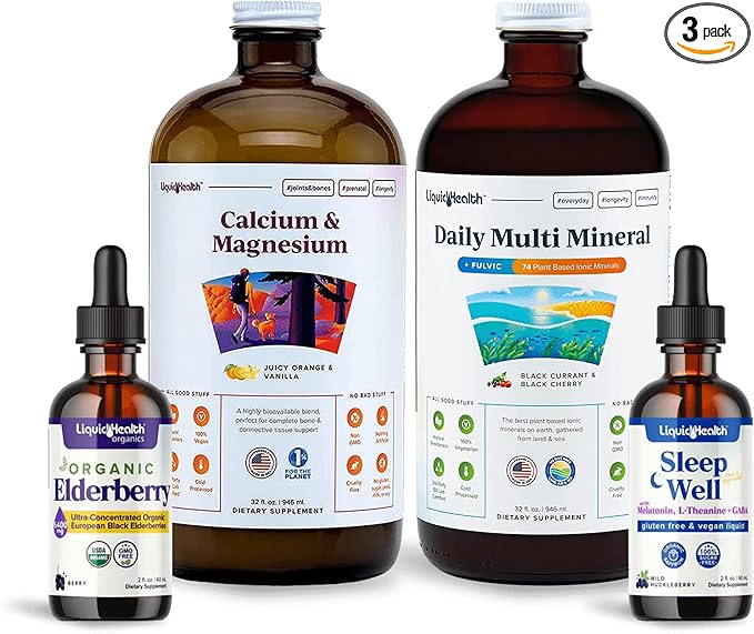 • THE ULTIMATE ADULT VITAMIN BUNDLE FOR RECOVERY, REST, & RELAXATION: Achieve optimal health and wellness (and a little TLC) with Liquid Health's Calcium & Magnesium multivitamin, Daily Multi Mineral supplement, Organic Elderberry Syrup drops, and Sleep Well Melatonin drops. These convenient liquid vitamin juices and drops taste great and will boost your immune system, help aid recovery after a long day, and promote relaxation.