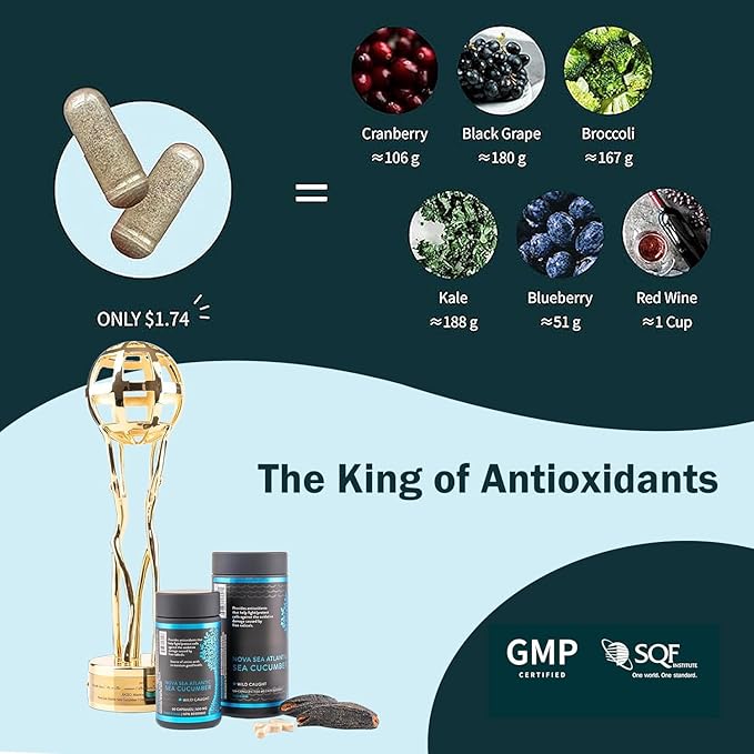 • 【Quality is Our DNA】Crafted with precision in Canada, our sea cucumber capsules undergo rigorous testing for effectiveness and safety. We are one of the few companies in Canada certified as a safe and quality food product during the processing of Atlantic sea cucumers. Our commitment to excellence has earned us prestigious awards, including the Best New Healthy Product Award at the 27th Annual Retail Council of Canada Awards, the Nova Scotia Minister of Innovation and Export Excellence Award, and the Nova Scotia Wild Blueberry Innovation Challenge Program Winner's Award.