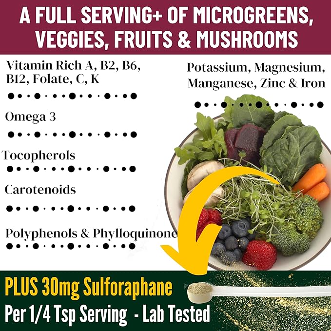 InviNutri Superfoods Powder (24 Servings) Solution for ARFID Special Needs Picky Eaters Microgreens Veggies Fruits Mushrooms, Turmeric, 40x Nutrient-Rich 30mg Sulforaphane Vitamin Supplement