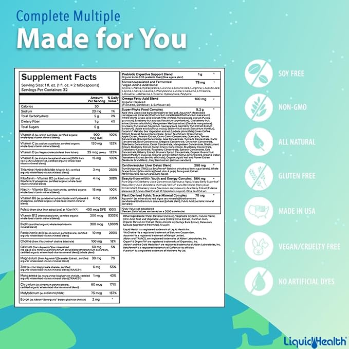 • COMPLETE LIQUID MULTIVITAMIN FOR MEN & WOMEN: Liquid Health's Complete Multiple provides over 200 essential vitamins, minerals, and nutrients for whole body health you can FEEL! With the Digestive Support blend, Amino Acids, Youth & Energy complex, and Trace Minerals you've got everything you need to keep your gut healthy, immune system boosted, energy levels up, and brain sharp.