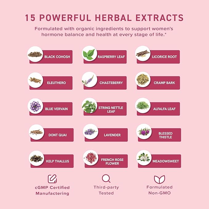 • ORGANIC LIQUID EXTRACTS: The organic herbal extract blend in this hormone balance supplement tincture includes Stinging Nettle Leaf, Red Raspberry, Eleuthero, Dong Quai, Licorice, Meadowsweet, French Rose, Black Cohosh, Chasteberry, Cramp Bark, Lavender, Blue Vervain and more.