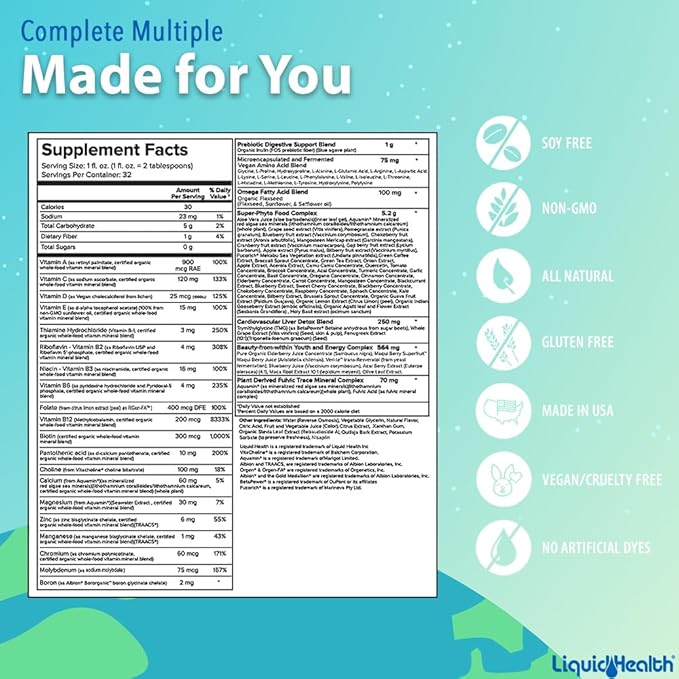 • LIQUID MULTIVITAMIN FOR MEN & WOMEN: Liquid Health's Complete Multiple provides over 200 essential vitamins, minerals and nutrients for whole body health you can FEEL! With the Digestive Support blend, Amino Acids, Youth & Energy complex, and Trace Minerals you've got everything you need to keep your gut healthy, immune system boosted, energy levels up, brain sharp, and more!