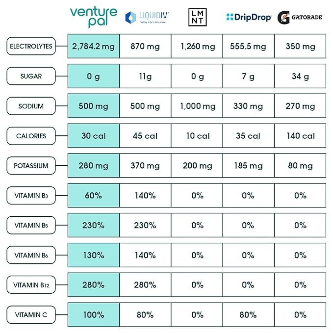 • SUGAR FREE AND OPTIMIZED FORMULA: Everyone knows that sodium plays a key role in maintaining fluid balance. However, most electrolyte mixes on the market are either too salty or too sweet. Venture Pal's Hydration Boost has zero sugar and an optimized sodium level within the daily value recommended by The American Heart Association