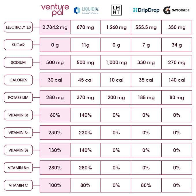 • SUGAR FREE AND OPTIMIZED FORMULA: Everyone knows that sodium plays a key role in maintaining fluid balance. However, most electrolyte mixes on the market are either too salty or too sweet. Venture Pal's Hydration Boost has zero sugar and an optimized sodium level within the daily value recommended by The American Heart Association