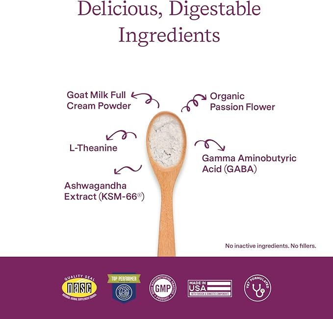 • No fillers: Our calming GABA supplements also feature KSM-66 ashwagandha, L-theanine and passion flower to help improve your pet’s mood and emotional balance; made with full cream goat milk for easy digestion