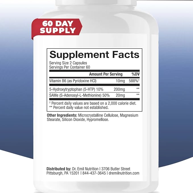 • Primary Supplement Type : DR. EMIL NUTRITION 200 MG 5-HTP Plus with SAM-e for Mood, Stress, and Sleep - 5HTP Supplement with Vitamin B6-120 Vegan Capsules, 60 Servings DR. EMIL NUTRITION 200 MG 5-HTP Plus with SAM-e for Mood, Stress, and Sleep - 5HTP Supplement with Vitamin B6-120 Vegan Capsules, 60 Servings