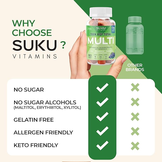 • 19 NUTRIENTS – Each of the SUKU multivitamin gummies are packed with 19 essential vitamins and minerals for a healthy diet. Especially formulated for use by teenage boys to ensure they get proper nutrition