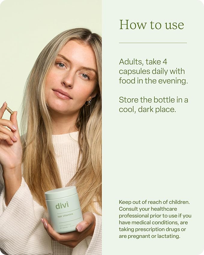 • Primary Supplement Type : divi Hair Vitamins for Women and Men - Made with Clean and Science-Backed Ingredients to Grow + Thicken - Create a Healthy Hair Environment - 30 Day Supply, 120 Count divi Hair Vitamins for Women and Men - Made with Clean and Science-Backed Ingredients to Grow + Thicken - Create a Healthy Hair Environment - 30 Day Supply, 120 Count