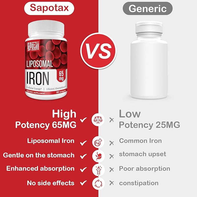 • Enhanced Absorption Formulation: Iron supplement is designed for high efficiency and based on liposomal technology, absorption of liposomal gentle iron is 3.5 times higer than ordinary iron pill, 4.1 times higer than ferric gluconate,2.7 times higher than iron sulfate, and 5 times higher than ferrous fumarate.Therefore the liposomal iron for iron deficiency is easily absorbed through the cell membrane getting more iron into your cells making it to be perfect iron supplements.