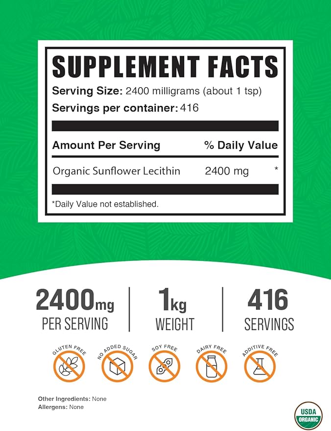 BulkSupplements.com Organic Sunflower Lecithin Powder - Sunflower Lecithin Supplement, Lecithin Powder Food Grade - Vegan & Gluten Free, 2400mg per Serving, 1kg (2.2 lbs) (Pack of 1)