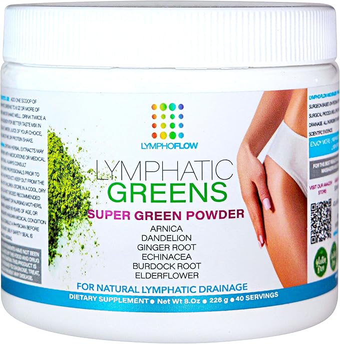 • LYMPHATIC DRAINAGE GREENS POWDER is a meticulously curated blend of highly potent natural ingredients designed to support and optimize your lymphatic system. Developed by a Board Certified Plastic Surgeon, this formula is specifically crafted to aid in post-surgery recovery, enhance the results of lymphatic massage, and promote the elimination of toxins and impurities, providing a rejuvenated and revitalized feeling.