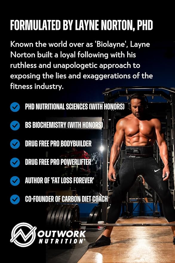 • Founded By Lane Norton, Ph.D. : Renowned as 'BioLayne', Layne Norton is a respected figure in the fitness industry, known for his commitment to evidence-based practices; Outwork Nutrition's pre-workout and workout recovery supplements were created under his guidance to provide science-based supplements for individuals dedicated to rigorous training and mindful nutrition