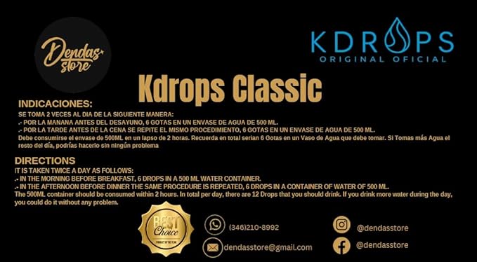 • Easy-to-Use Liquid Formula: Simply take the recommended dose of drops each day, making KDROPS a convenient addition to your routine. "Fórmula Líquida de Fácil Uso: Simplemente toma la dosis recomendada de gotas cada día, convirtiendo a KDROPS CLASSIC- Gotas para bajar de Peso, en una adición conveniente a tu rutina."