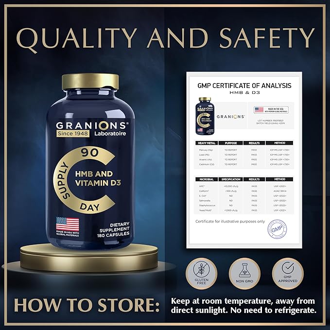 • QUALITY AND TRUST - Manufactured by Granions Laboratoire, a trusted name in supplements, our HMB and Vitamin D3 supplement is cGMP approved and produced under strict quality control standards.