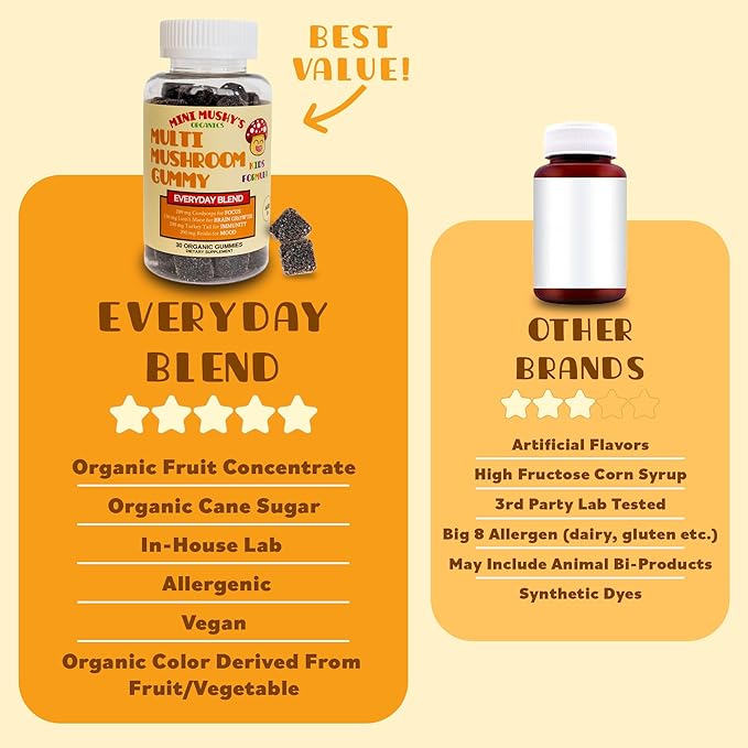 • The Perfect Solution: Looking for the perfect daily support gummy for your child? You've found it! Mini Mushy's Everyday Blend gummies are specifically created to support a holistic approach to your kid's well-being. Help them put their best foot forward with a boost to their wellness with easy-to-take gummies even the pickiest of eaters will love.