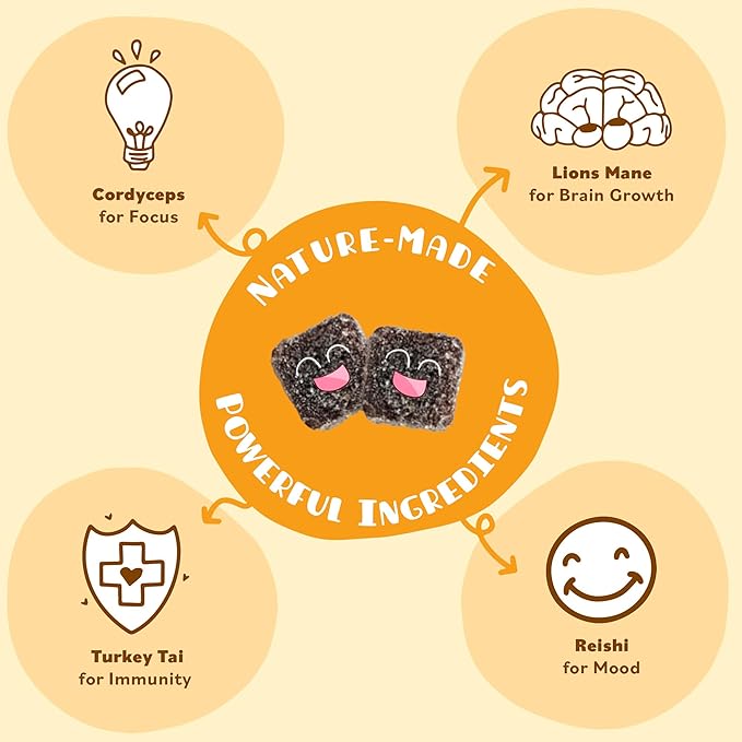 • The Power of Mushrooms: Unleash the power of one of Mother Nature's greatest superfoods - mushrooms! Our Everyday Blend gummies are holistically balanced to support your child's well-being. They include 200mg of Cordyceps for focus, 120mg of Lion's Mane to support brain growth, 200mg of Turkey Tail for immune support, and 200mg of Reishi to support your child's mood and recovery.