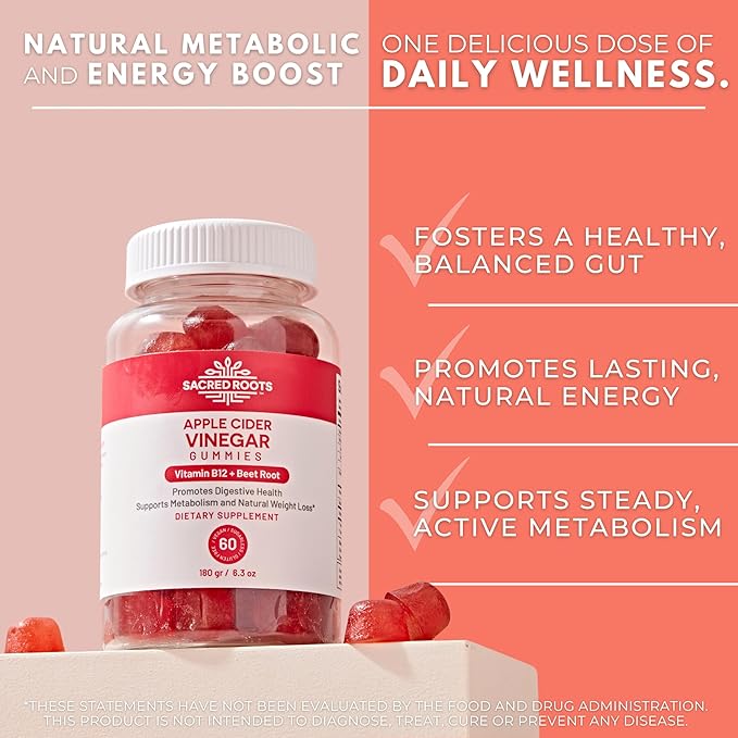 • SACRED ROOTS ACV GUMMIES: Sacred Roots Apple Cider Vinegar Gummies provide a convenient way to support overall wellness. With their blend of apple cider vinegar, B12, and Beetroot, these gummies can aid in maintaining optimal digestive health and immune control.