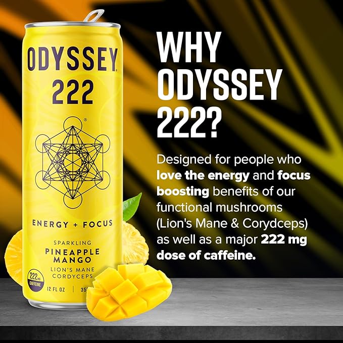 Odyssey Elixir - Odyssey 222 - Sparkling Energy Drink - 222 mg of Caffeine - Lion's Mane & Cordyceps - Energy & Focus - Endurance & Stamina - Nootropic - Pre Workout - Pineapple Mango
