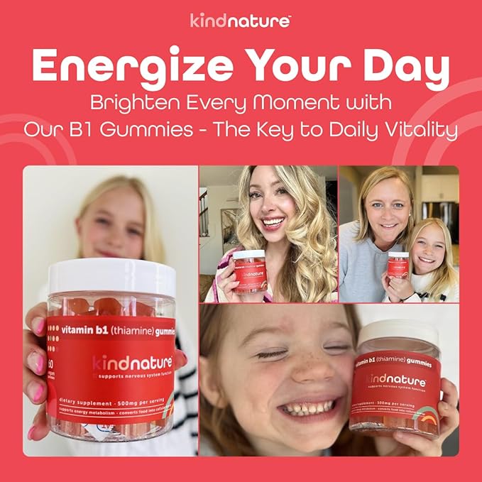Kind Nature Vitamin B1 Gummies - Chewable Thiamine 500mg per Serving - Non GMO, Vegan, Natural Strawberry Flavor Thiamine B1 Supplement for Adults & Kids