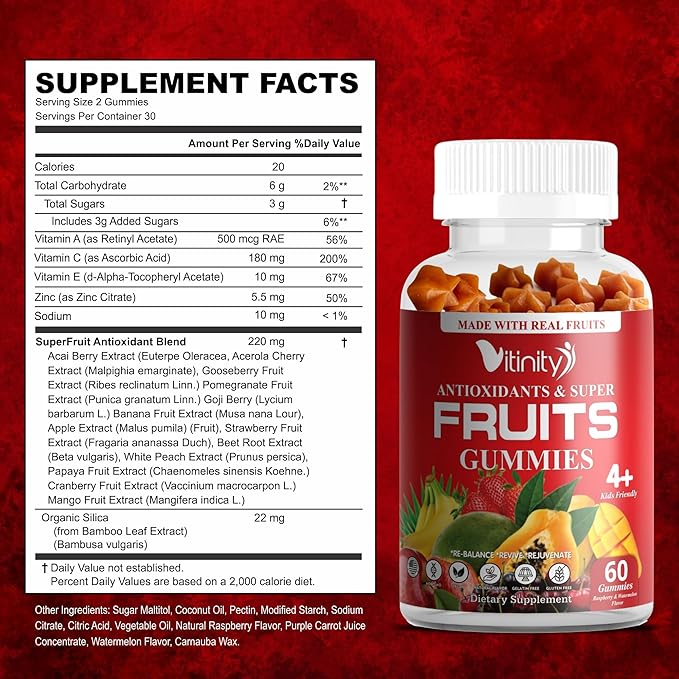 • [Powerful Antioxidants]: Vitamin C,Zinc, Acai Fruit Extract with a mix of other superfruit extracts eliminate the toxins that are harmful to body cells and tissues.