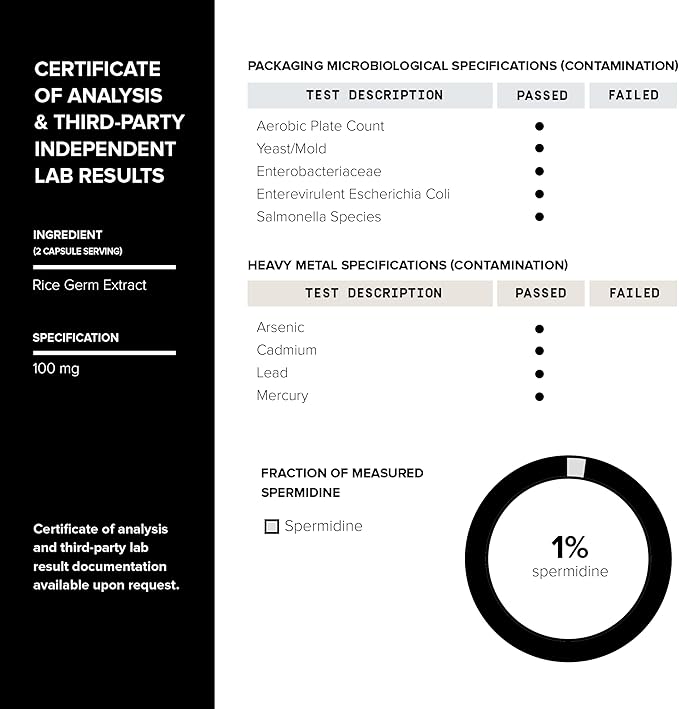 • Additional Polyamine Benefits - Our Spermidine complex is enhanced with 100mg of rice germ extract, providing a natural source of additional spermidine while also ensuring the studied benefits of naturally occurring polyamines.