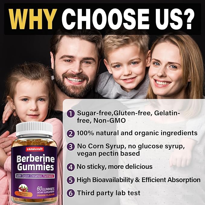 • [Vegan, Gelatin Free, Sugar free]: Each bottle of Vidabotan Berberine gummies made of 60 vegan, all natural, non-GMO & gluten-free sugar free gummies.