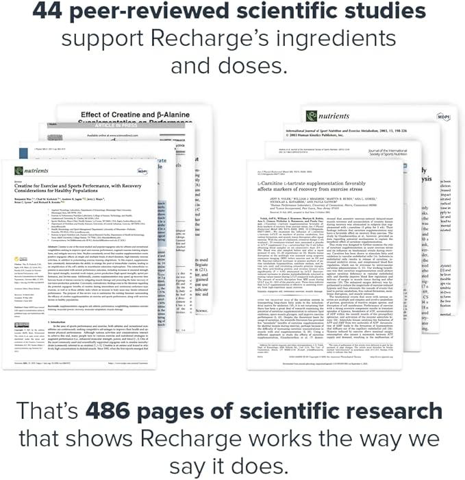 • 44 peer-reviewed scientific studies support Recharge’s combination of ingredients and doses, including flavored creatine. That’s 486 pages of scientific research that shows Recharge muscle builder for men and women works exactly like we say it does.