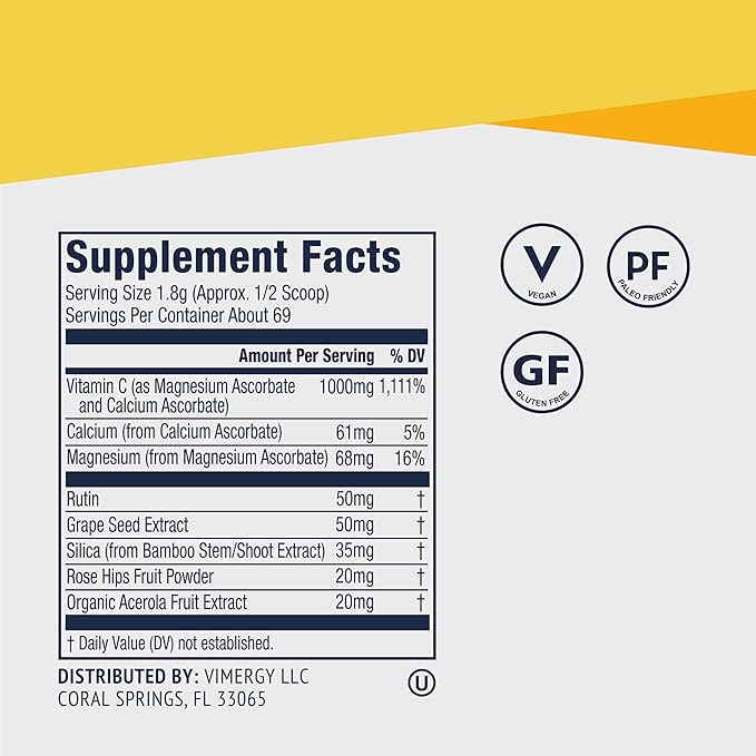 • CLEAN FORMULA Vimergy is dedicated to label transparency. Our products are designed with the most sensitive in mind. Unlike other vitamin C gummies, tablets and capsules, Vimergy Micro-C Immune Power*TM contains no hidden colors, fillers, or other troublesome ingredients. It is gluten-free, sugar-free and preservative-free. Vimergy Micro-C Immune Power*TM is also non-GMO, vegan, Kosher and packed with only the active ingredients you need without the problematic ingredients you don’t.