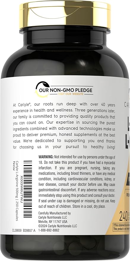 Carlyle L-Arginine L-Citrulline Supplement | 2250mg | 240 Capsules | Nitric Oxide Precursors | Free Form | Non-GMO & Gluten Free