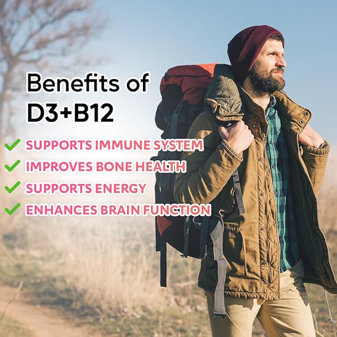 • Vitamin D3 is a vital nutrient that helps to maintain strong bones, supports the immune system, and aids in the absorption of calcium. Vitamin B12 is essential for healthy brain function, nerve health, and the production of red blood cells. Both nutrients work together to support overall energy levels and contribute to a healthy mood.