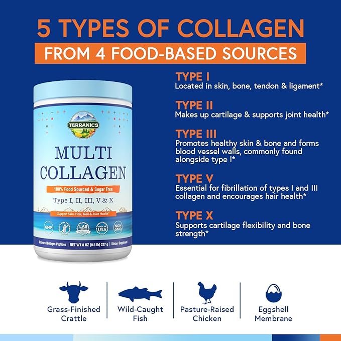 • 100% Ethically Sourced: Terranics Multi Collagen Peptides Powder comes from 4 premium real food sources - pasture-raised & cage-free cattle and chickens, wild-caught deep-sea fish and U.S. farmed eggs. This specially crafted multi collagen protein powder formula does NOT contain peanuts, tree nuts, shellfish, corn, milk, soybean, wheat or growth hormones.