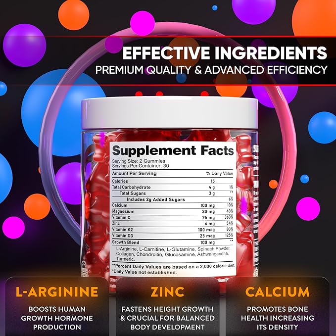 • Unlock your height potential- Achieve your dream height with our growth supplement, a gluten-free formula designed to boost bone growth and increase height. Maximize your growth potential with our height enhancer pills, packed with essential vitamins and minerals to support bone growth. Support your growth with our height gummies for kids, teens and adults. The blend contains perfectly balanced ingredients. Get healthy bone growth & strength with our natural product.